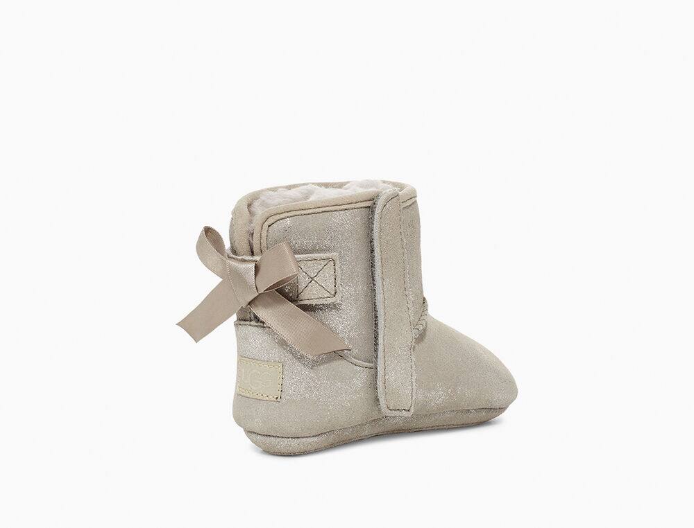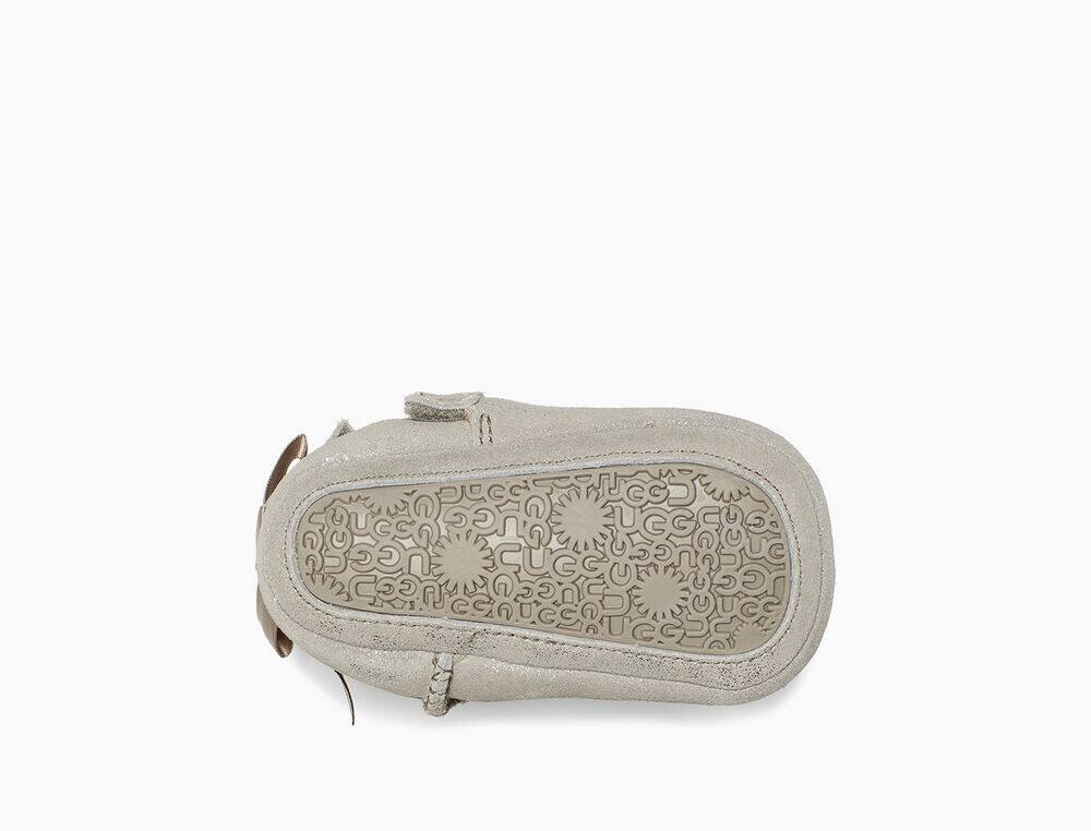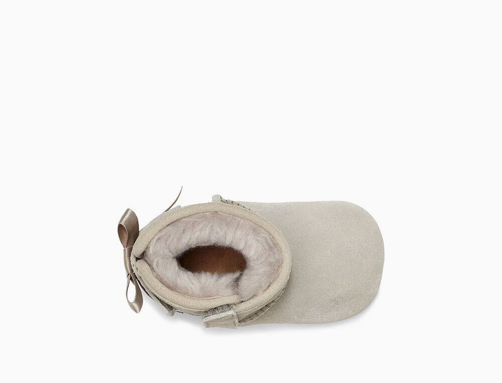 Metallic suede upper Fixed satin bow along back shaft Hook-and-loop closure 17mm UGGplush™ 80% wool, 20% lyocell lining Suede outsole, Molded rubber outsole 3.75" shaft height Woven heel label with UGG® logo |