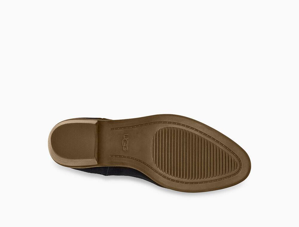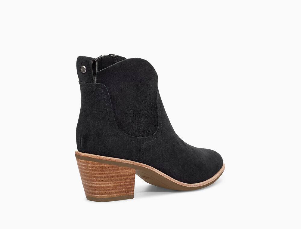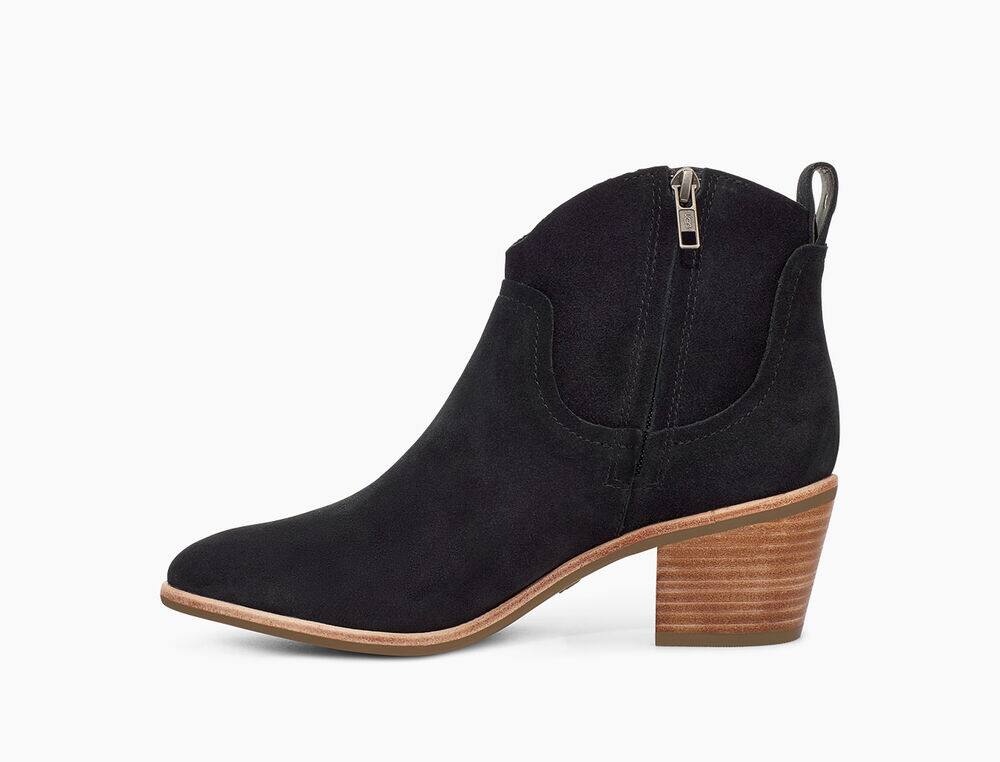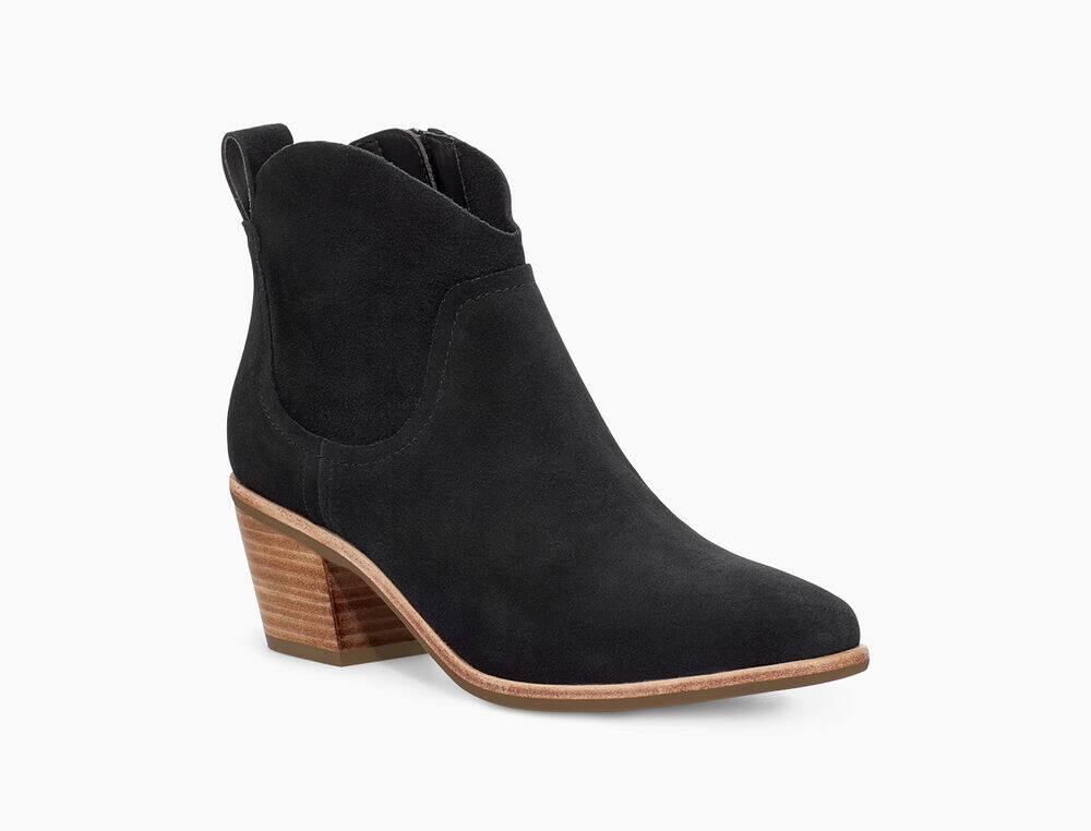 Waterproof suede upper Rear pull tab Textile lining, Leather heel lining, Synthetic lining Synthetic sockliner & Foam footbed Molded rubber outsole Stacked leather wrapped heel 5.75" shaft height 2" heel height Water-Resistant UGG® logo rivet, Heat-embossed UGG® logo |