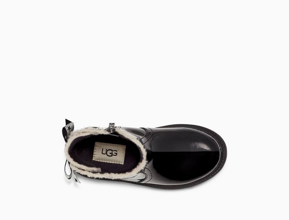 Patent leather upper Fixed bow, Synthetic overlays Medial zipper Antimicrobial lining Foam footbed Molded rubber outsole Woven label with UGG® logo |