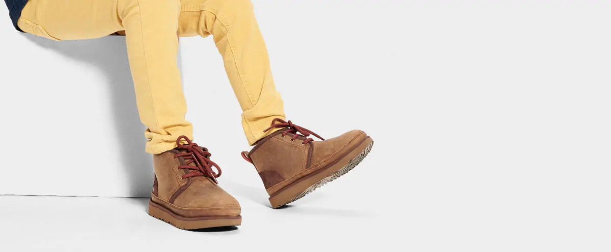 ![]() Warm and soft, our best-selling Neumel features ultra-soft UGGpure™ wool lining to keep your little one warm and cozy. Crafted from seam-sealed waterproof leather to help protect against the elements, this chukka is built to move the way kids do, incorporating rocker-bottom construction for a barefoot feel and our super-lightweight outsole for traction and durability. This product was made in a factory that supports women in our supply chain with the help of HERproject, a collaborative initiative that creates partnerships with brands like ours to empower and educate women in the workplace. Waterproof Features Seam-sealed construction Waterproof leather Gusseted zipper with non-wicking tape Gusseted tongue Rear pull tab Cotton laces 17mm UGGpure™ wool lining 17mm UGGpure™ wool insole Foam footbed Treadlite by UGG™ outsole for comfort Heat-embossed UGG® logo, UGG® logo woven label on sockliner Additional set of laces included Best for: Casual, Light or moderate rain, Light snow |